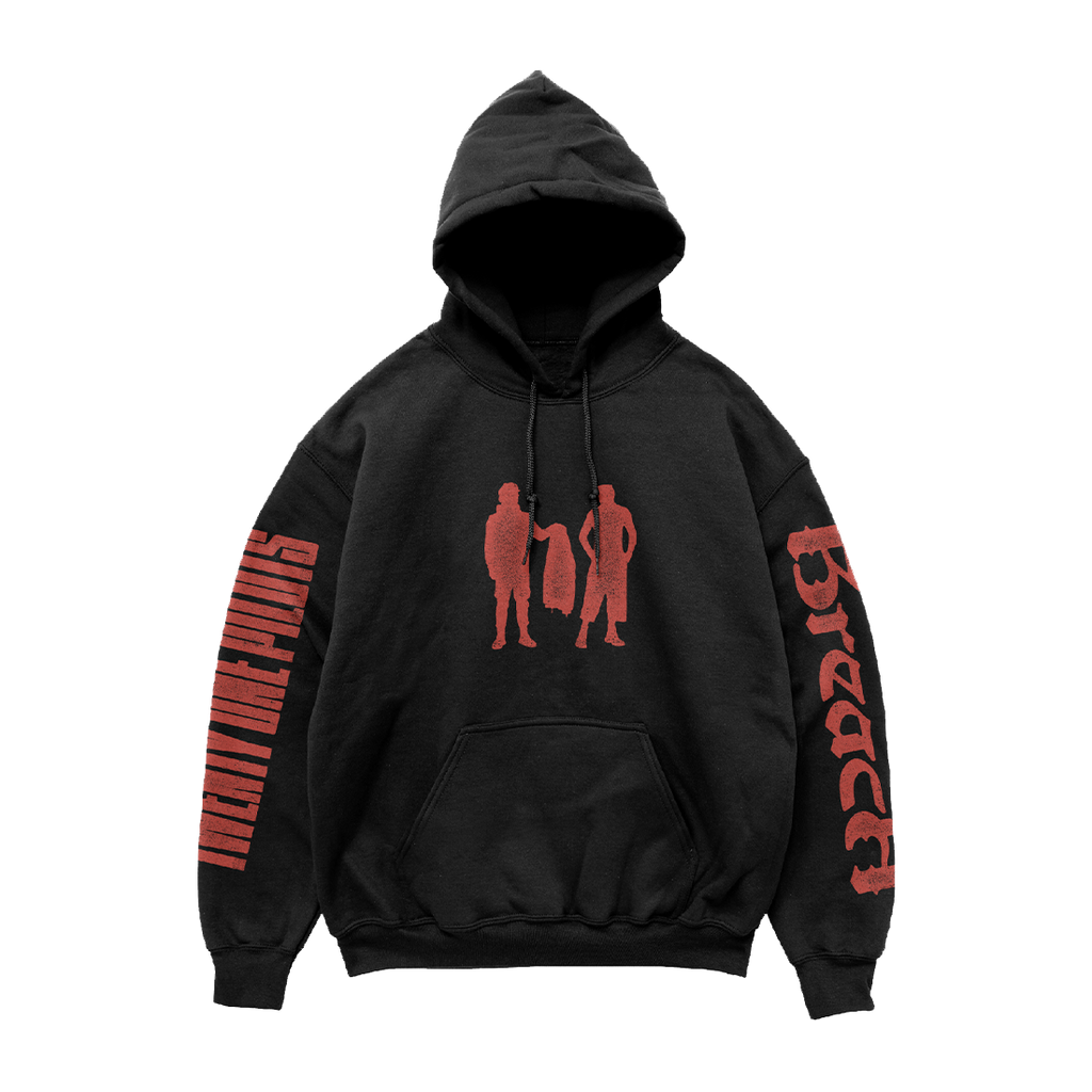 THE TWENTY ONE PILOTS ‘BREACH HOODIE’ FEATURES A SILHOUETTE OF THE ALBUM ART OF THE FRONT AND PRINTS DOWN EACH SLEEVE OF A UNISEX BLACK HOODIE. 70/30 RING SPUN COTTON/POLYESTER.