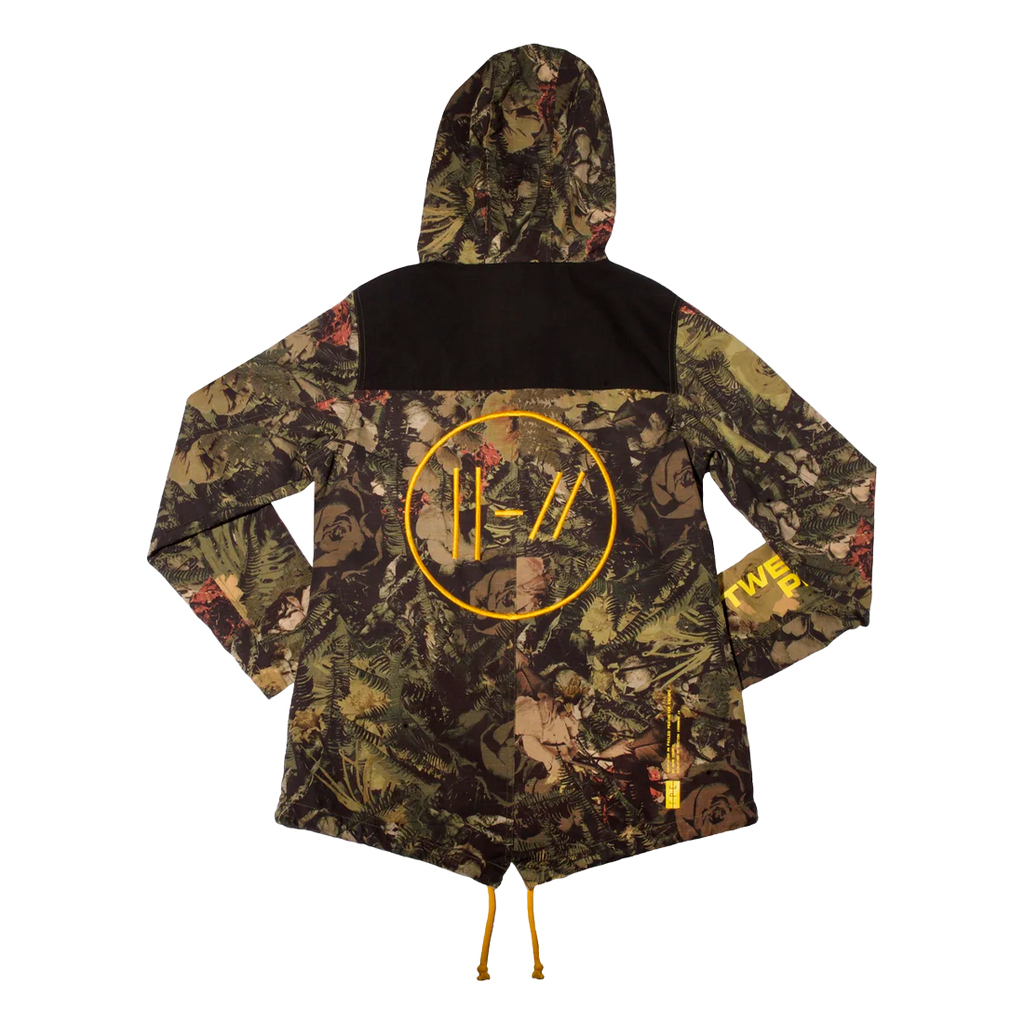 The Twenty One Pilots 'Windbreaker' here features 'TWENTY ONE PILOTS' in yellow text on the right sleeve and the signature Twenty One Pilots symbol on the back of the design in yellow. This design is on a camouflage and black windbreaker.YOU MIGHT ALSO LIKE